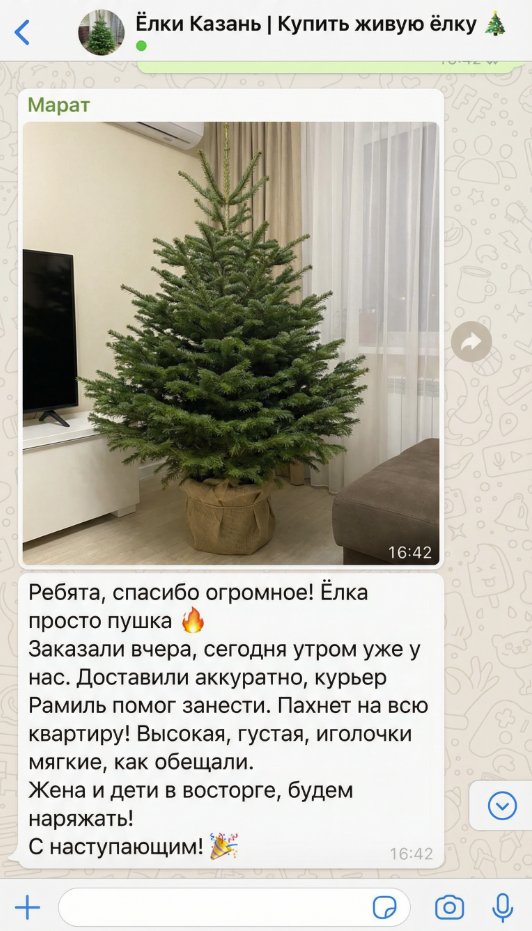 Хотела купить живую елку в Казани. Брал елку себе домой! Мне без разницы, елка и елка. Дети и жена остались довольны. Цены относительное Казани понравились, и самое главное что не надо было ехать никуда, привезли я оплатил все четко и просто. Поэтому вас и выбрал.
